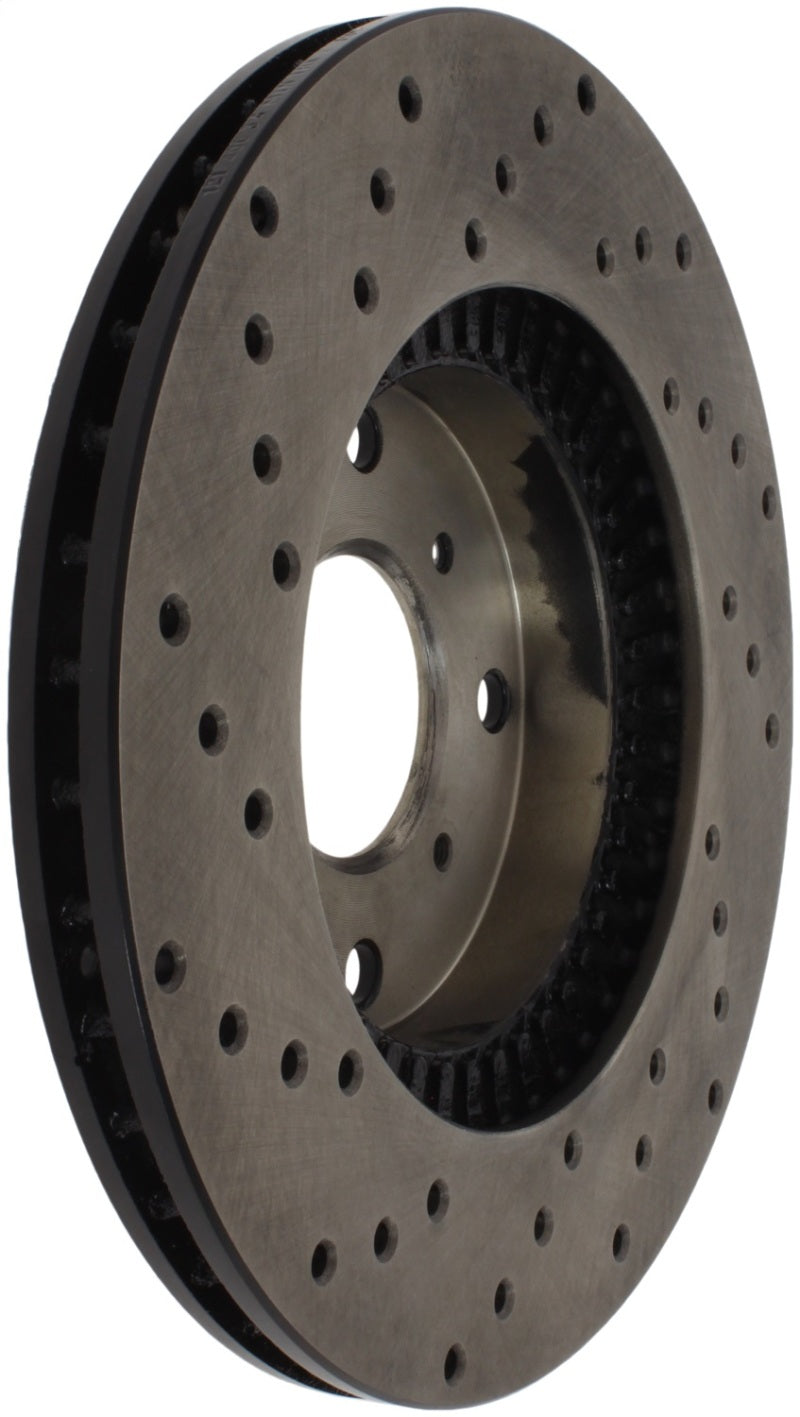 StopTech Drilled Sport Rotors are 1-piece direct replacement brake discs for factory brake systems and stock calipers that look great behind your wheels – and offer significantly improved braking performance. The unique cross-drilling aids with heat and brake dust dispersal; prevents glazing of the pads; adds bite and improves wet and dry braking performance. Built to last; the black e-coating provides protection from corrosion and the high carbon metallurgy (in most applications) offers quieter operation; better crack resistance and increased performance.
