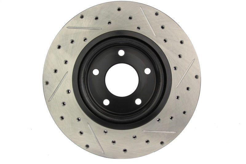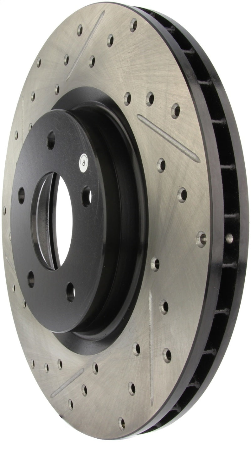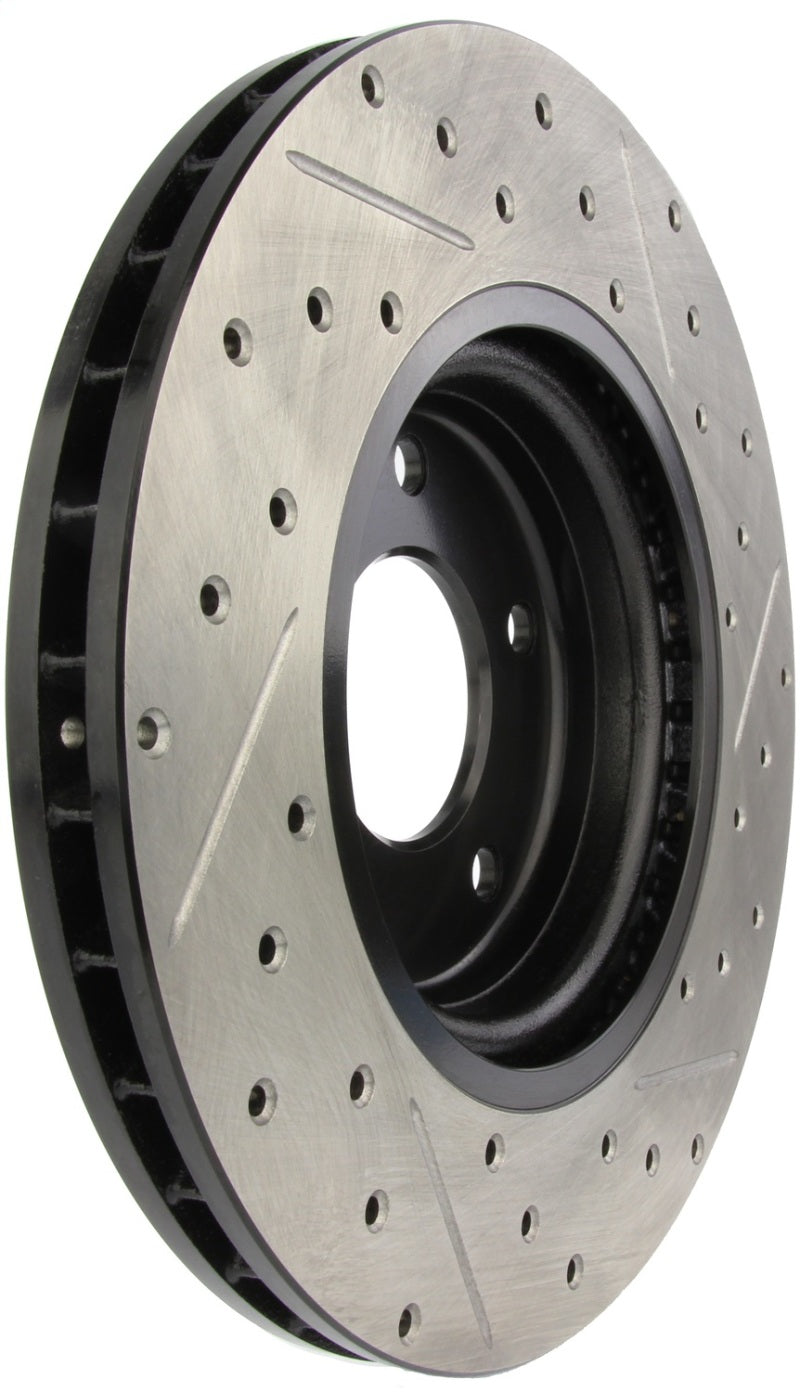 StopTech Drilled and Slotted Sport Rotors are 1-piece direct replacement brake discs for factory brake systems and stock calipers that look great behind your wheels – and offer significantly improved braking performance. The unique cross-drilling and slotting aids with heat and brake dust dispersal, prevents glazing of the pads, adds bite and improves wet and dry braking performance. Built to last, the black e-coating provides protection from corrosion and the high carbon metallurgy (in most applications) offers quieter operation, better crack resistance and increased performance.