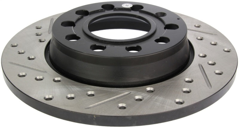 StopTech Drilled and Slotted Sport Rotors are 1-piece direct replacement brake discs for factory brake systems and stock calipers that look great behind your wheels – and offer significantly improved braking performance. The unique cross-drilling and slotting aids with heat and brake dust dispersal, prevents glazing of the pads, adds bite and improves wet and dry braking performance. Built to last, the black e-coating provides protection from corrosion and the high carbon metallurgy (in most applications) offers quieter operation, better crack resistance and increased performance.