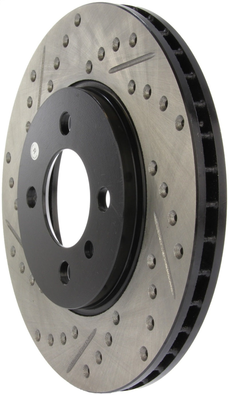 StopTech Drilled and Slotted Sport Rotors are 1-piece direct replacement brake discs for factory brake systems and stock calipers that look great behind your wheels – and offer significantly improved braking performance. The unique cross-drilling and slotting aids with heat and brake dust dispersal, prevents glazing of the pads, adds bite and improves wet and dry braking performance. Built to last, the black e-coating provides protection from corrosion and the high carbon metallurgy (in most applications) offers quieter operation, better crack resistance and increased performance.