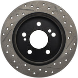 StopTech Drilled and Slotted Sport Rotors are 1-piece direct replacement brake discs for factory brake systems and stock calipers that look great behind your wheels – and offer significantly improved braking performance. The unique cross-drilling and slotting aids with heat and brake dust dispersal, prevents glazing of the pads, adds bite and improves wet and dry braking performance. Built to last, the black e-coating provides protection from corrosion and the high carbon metallurgy (in most applications) offers quieter operation, better crack resistance and increased performance.