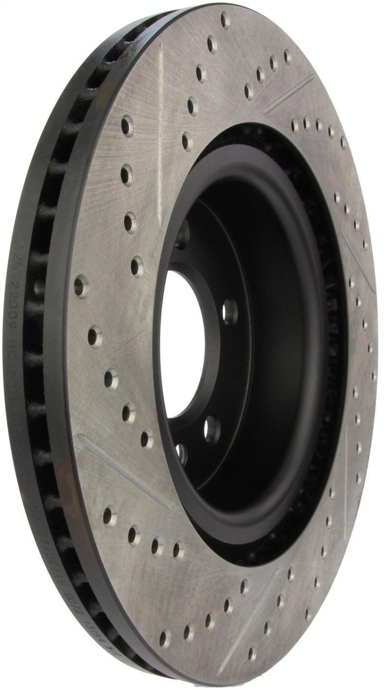 StopTech Drilled and Slotted Sport Rotors are 1-piece direct replacement brake discs for factory brake systems and stock calipers that look great behind your wheels – and offer significantly improved braking performance. The unique cross-drilling and slotting aids with heat and brake dust dispersal, prevents glazing of the pads, adds bite and improves wet and dry braking performance. Built to last, the black e-coating provides protection from corrosion and the high carbon metallurgy (in most applications) offers quieter operation, better crack resistance and increased performance.