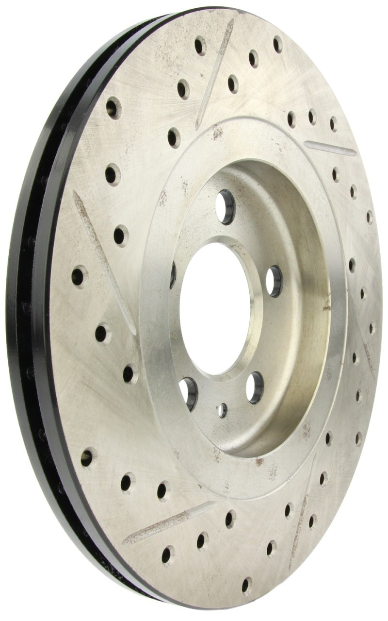 StopTech Drilled and Slotted Sport Rotors are 1-piece direct replacement brake discs for factory brake systems and stock calipers that look great behind your wheels – and offer significantly improved braking performance. The unique cross-drilling and slotting aids with heat and brake dust dispersal, prevents glazing of the pads, adds bite and improves wet and dry braking performance. Built to last, the black e-coating provides protection from corrosion and the high carbon metallurgy (in most applications) offers quieter operation, better crack resistance and increased performance.