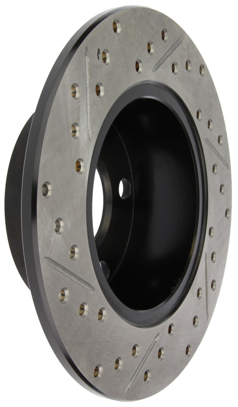 StopTech Drilled and Slotted Sport Rotors are 1-piece direct replacement brake discs for factory brake systems and stock calipers that look great behind your wheels – and offer significantly improved braking performance. The unique cross-drilling and slotting aids with heat and brake dust dispersal, prevents glazing of the pads, adds bite and improves wet and dry braking performance. Built to last, the black e-coating provides protection from corrosion and the high carbon metallurgy (in most applications) offers quieter operation, better crack resistance and increased performance.